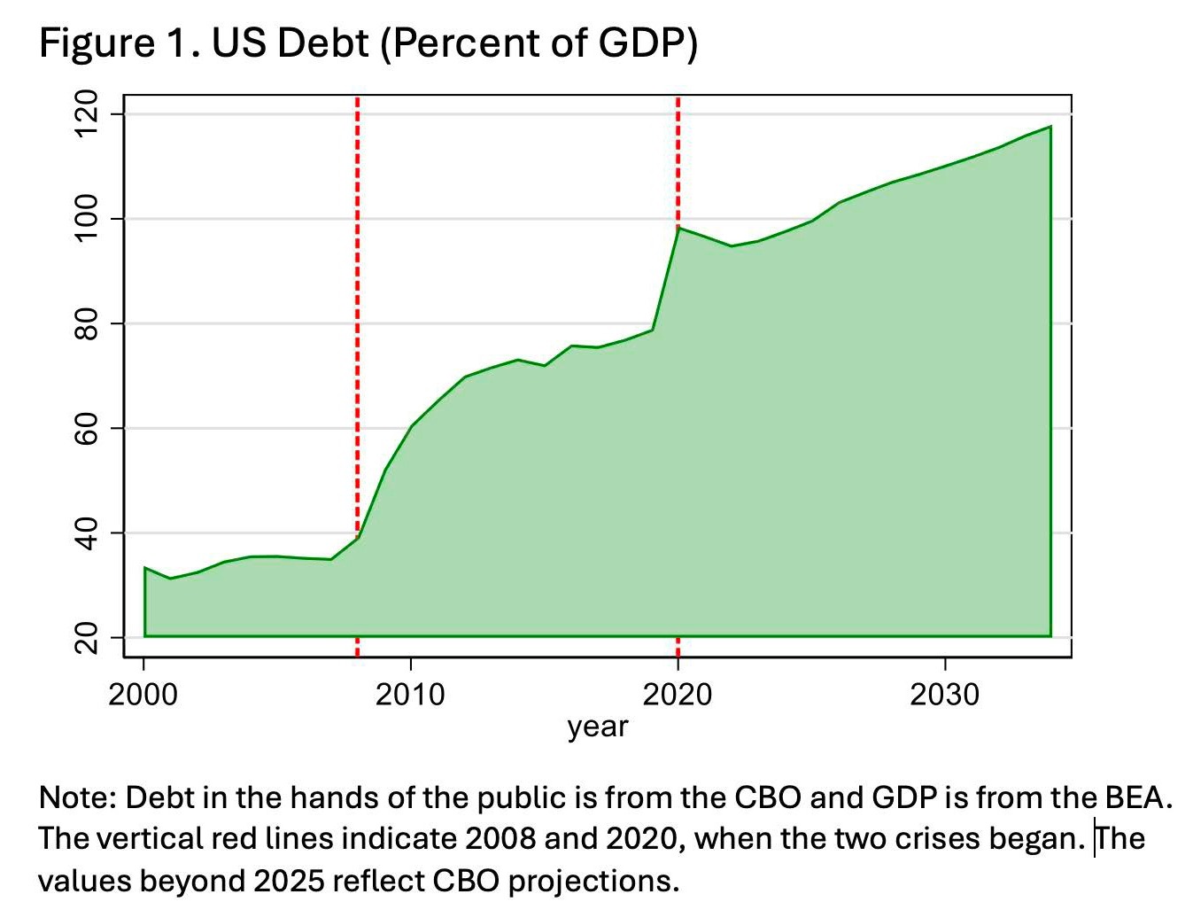 The debt level is so high that the United States now spends more on interest payments than on defense. The problem will only get worse, since the aging of the population is projected to raise spending on Social Security and Medicare. By most accounts, the United States is now on an unsustainable debt path.