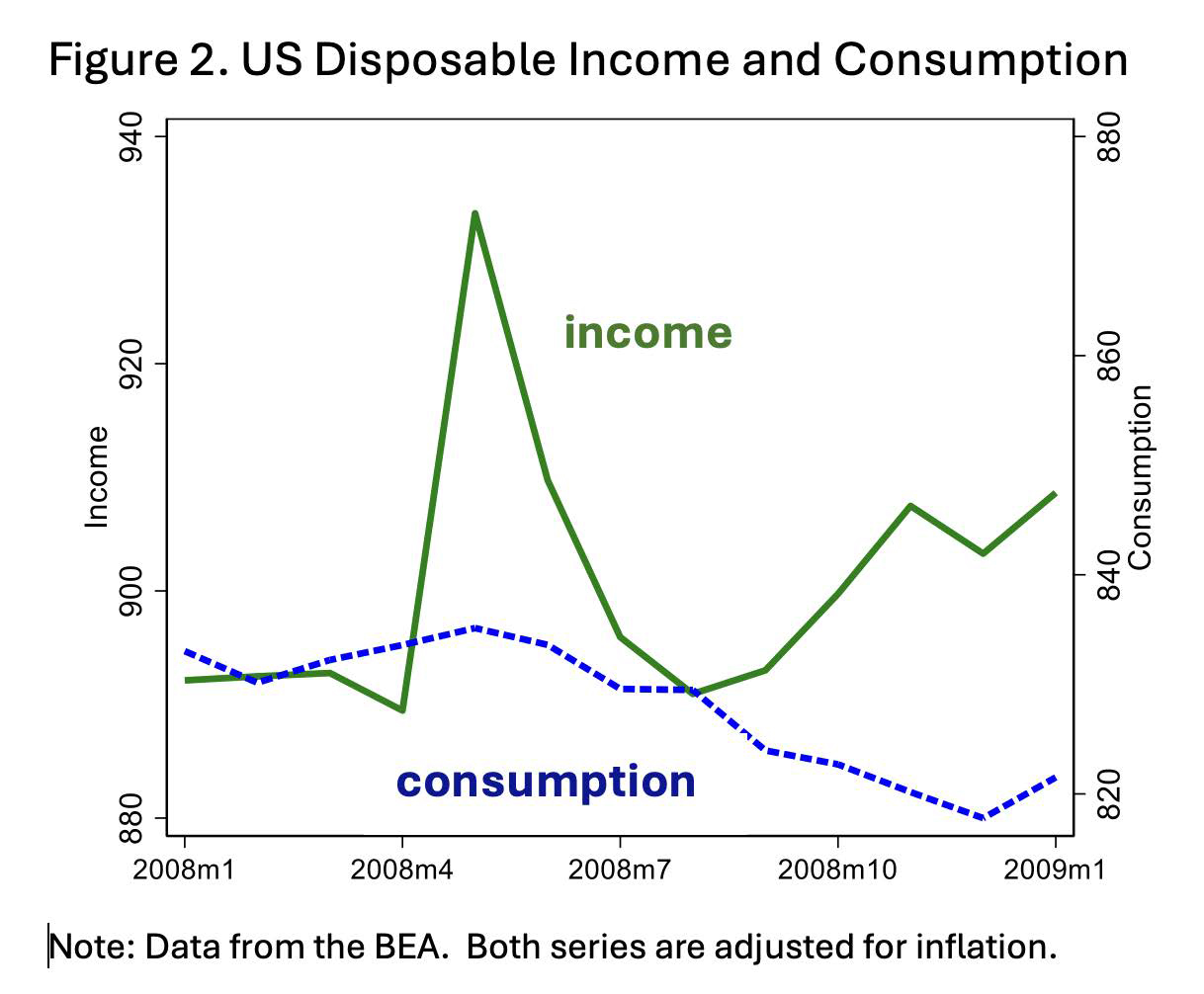 However, there is no evidence of such a boost in the aggregate data. In a recently published paper, my coauthors Johannes Wieland and Jacob Orchard and I pointed out that income spiked up with the arrival of the rebates, but consumer spending rose only slightly (figure 2). If households had spent as much as the estimates suggested, there should have been a big spike in consumption, even after accounting for the fall in consumption from the collapse in housing prices.