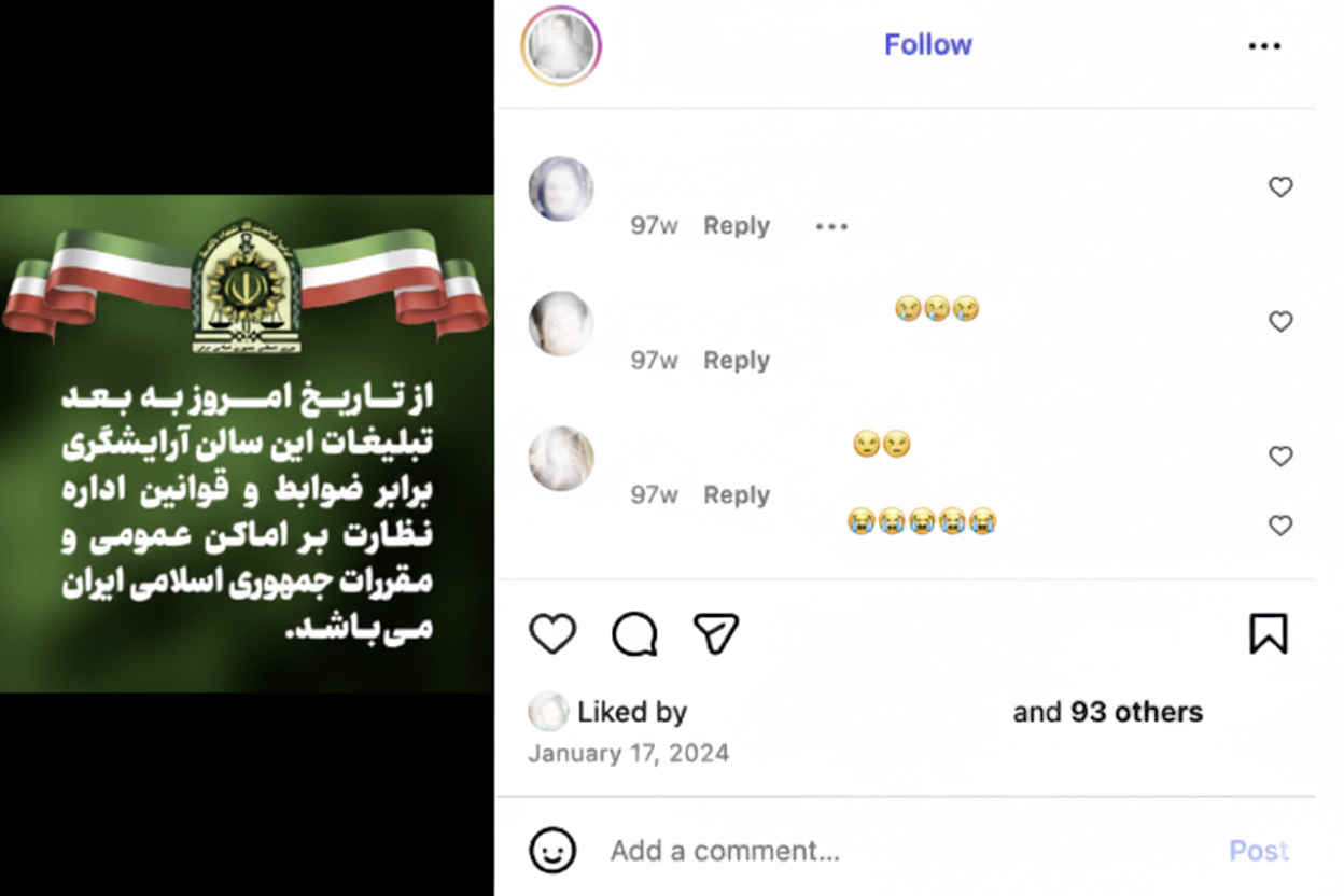 In 2024, these censorship efforts expanded with the passing of a new law by the Islamic Republic imposing strict licensing requirements on online businesses, effectively incorporating digital commerce into the state’s formal regulatory framework by requiring registration, taxation of income, and compliance with government moral oversight. This has justified the FATA in suppressing businesses and public spaces such as cafes and restaurants, particularly those owned by Iranian women.