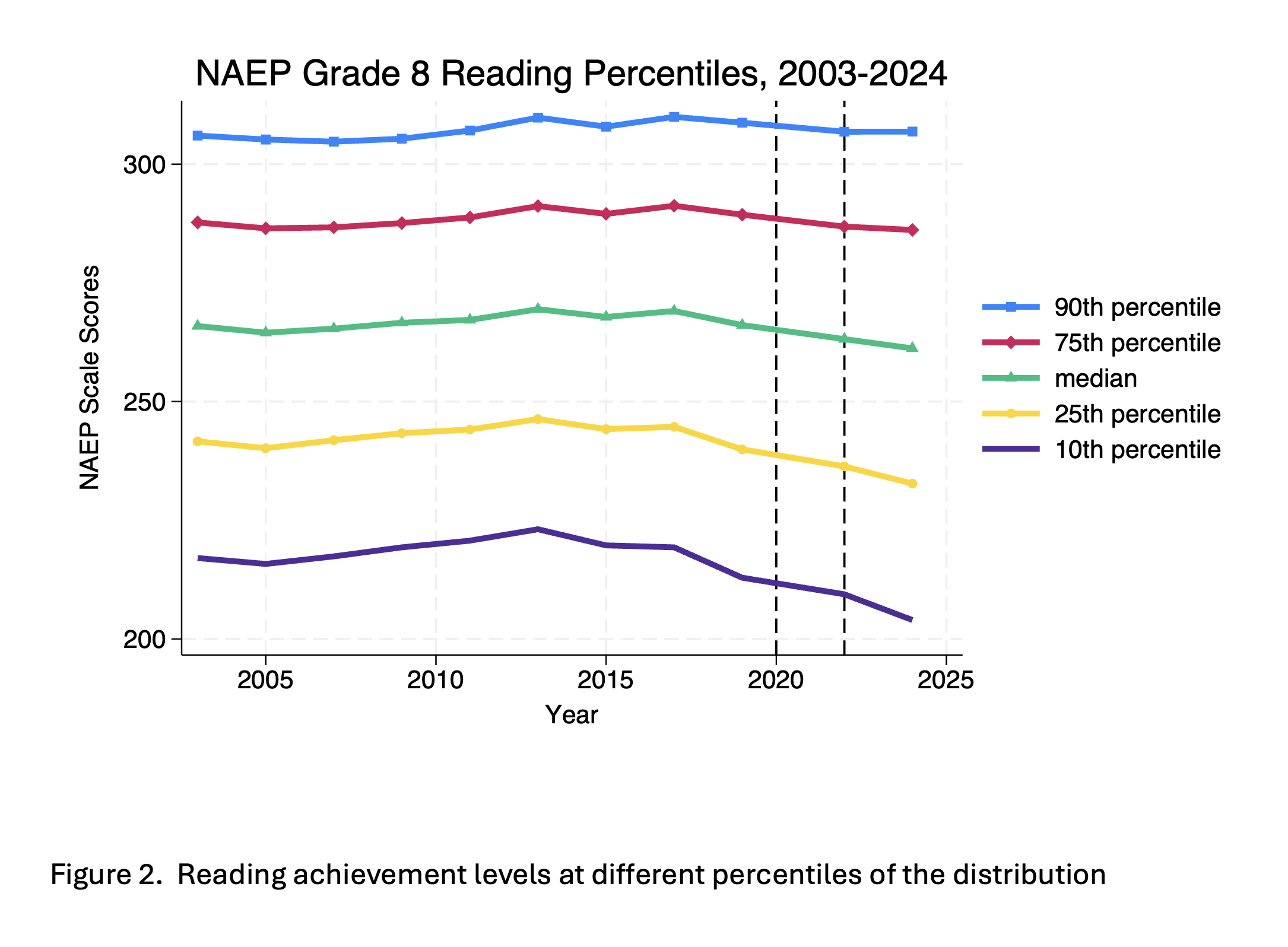 The decline in scores has also been accompanied by a widening of the achievement distribution: lower-achieving students have suffered greater declines than those at the top of the achievement distribution. And, again, while the pandemic led to public concerns about disparate impacts on disadvantaged students, this increased spread in learning actually began in 2013 and continued through 2024 (figure 2).