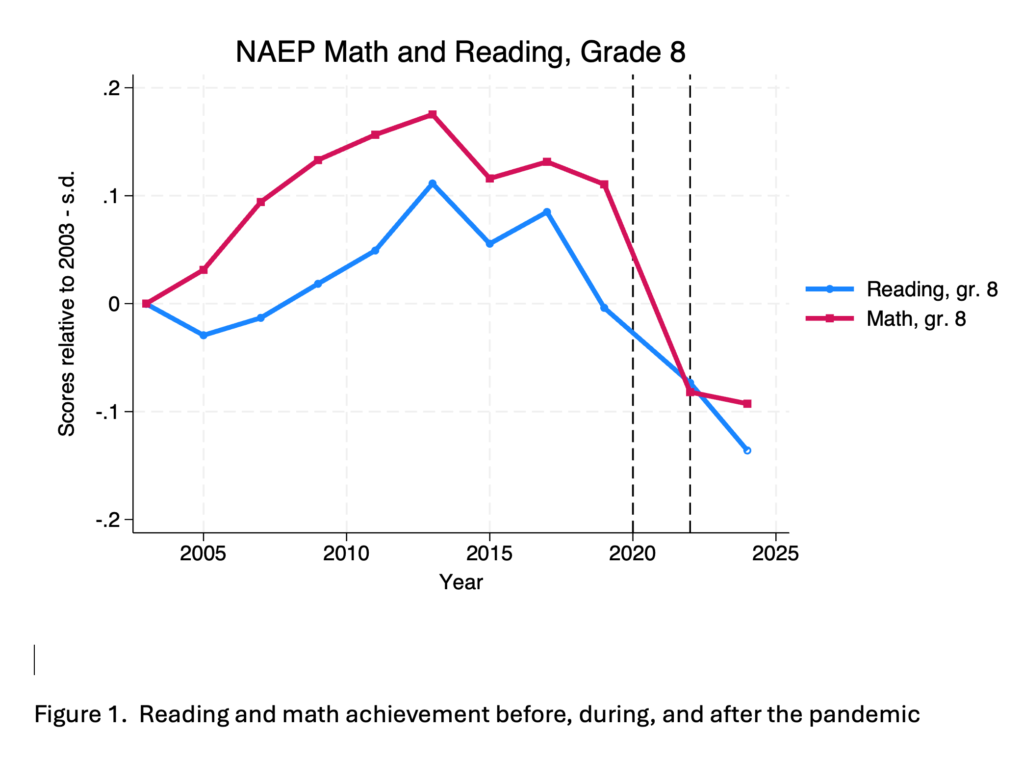 Both math and reading performance began falling after 2013, well before the start of the pandemic. As seen in figure 1, scores for eighth-graders rose in the beginning of the century but started falling in 2013. The fall was more precipitous during the pandemic period (2019–22) but continued in the “recovery period” (2022–24). The average math and reading decline from 2013 to 2024 was 0.28 standard deviations. Just half of this occurred in 2019–22.